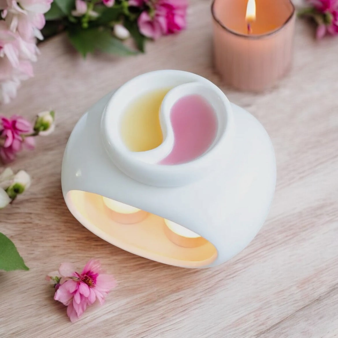 Ce brûleur double cavité en céramique blanche te permet de faire fondre deux fondants parfumés en même temps. Grâce à ses formes douces rappelant deux gouttes d’eau, il offre la possibilité de créer des mélanges subtils ou de varier les parfums selon tes envies.
